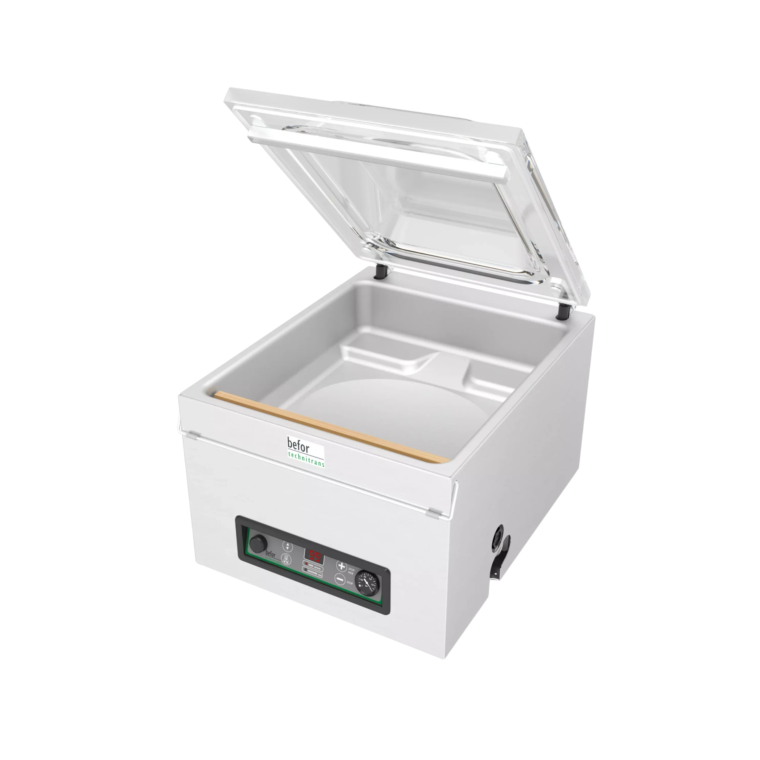 Découpe du film par cutter coulissant, Plaque PE avec tasseaux de positionnement sur banque, Freinage manuel de la bobine, INOX alimentaire.Applications : Rayon boucherie, charcuterie, fromagerie...